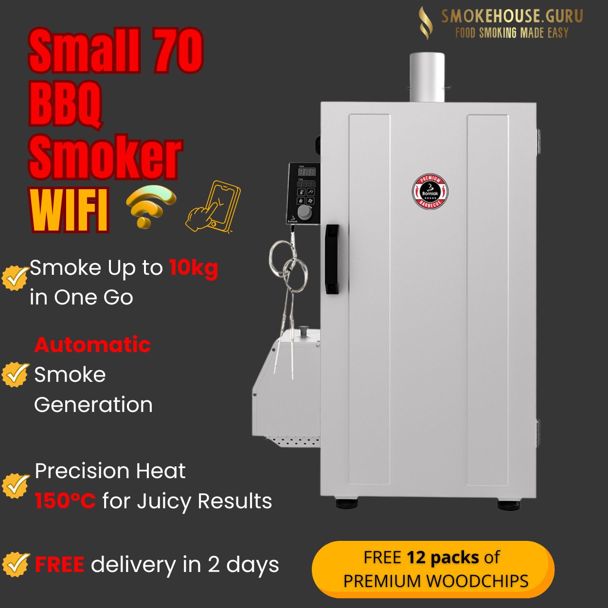 When you order your Borniak 70 WiFi Electric Smoker from Smokehouse.Guru, you’re not just getting a smoker – you’re getting a complete smoking package ready to go straight out of the box. Here’s exactly what arrives at your door: